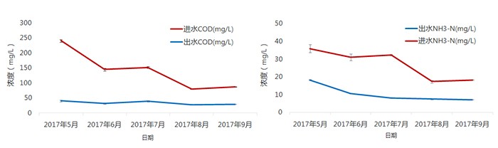 系统从17年5月开始运行,经过10天左右的驯化期,系统投入运行,通过4个月的水质监测,出水水质稳定。因其出水水质优良,河道的水质也日益改善,达到了消除黑臭的目标。
