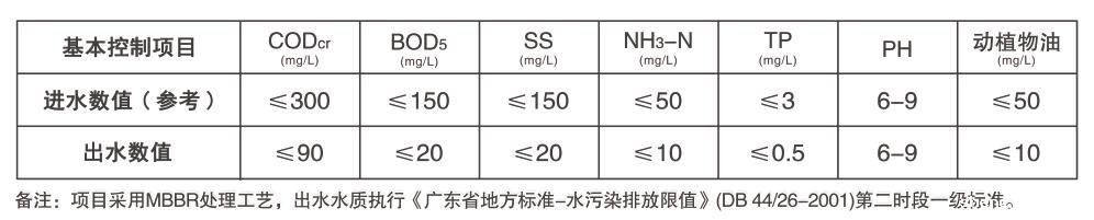 本项目为广东通驿高速公路服务区有限公司惠州市多祝停车区、加油站一体化污水处理项目,项目采用MBBR处理工艺,出水水质执行《广东省地方标准-水污染排放限值》(DB 44/26-2001)第二时段一级标准。