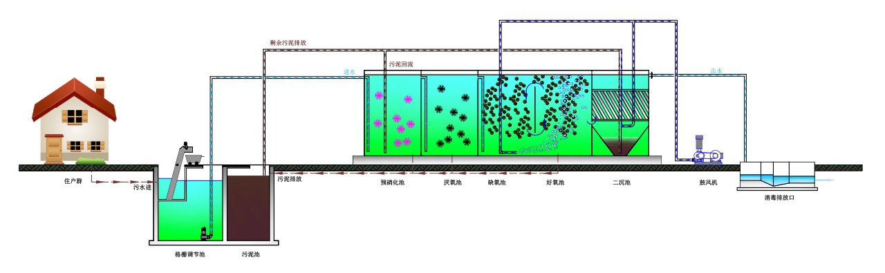 本项目为澄迈县福山咖啡文化风情镇花场村生活污水处理设备采购项目,项目出水水质执行《城镇污水处理厂污染物排放标准》(GB18918-2002)一级B标准。项目采用优米app赚钱自主研发E-co-MBBR一体化处理工艺,具有以下优势: