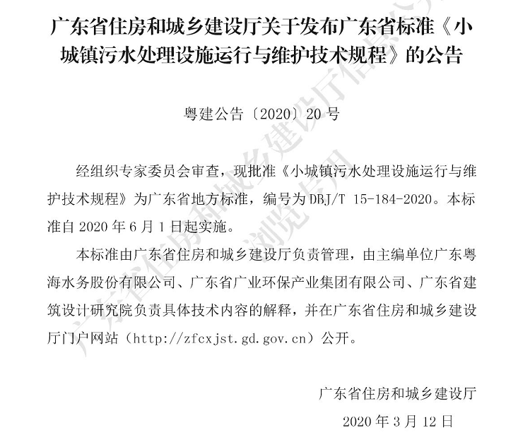 为贯彻《中华人民共和国环境保护法》、《中华人民共和国水污染防治法》、《广东省环境保护条例》等法律法规,提升城乡污水治理水平,规范小城镇污水处理设施运行、维护过程,确保设施有效、稳定、安全运行,充分发挥处理设施的使用功能。广东省正加快城乡污水处理设施的建设,为更好地开展建设工作,广东省住房和城乡建设厅发布了《小城镇污水处理设施运行与维护技术规程》,并于2020年6月1日起实施。