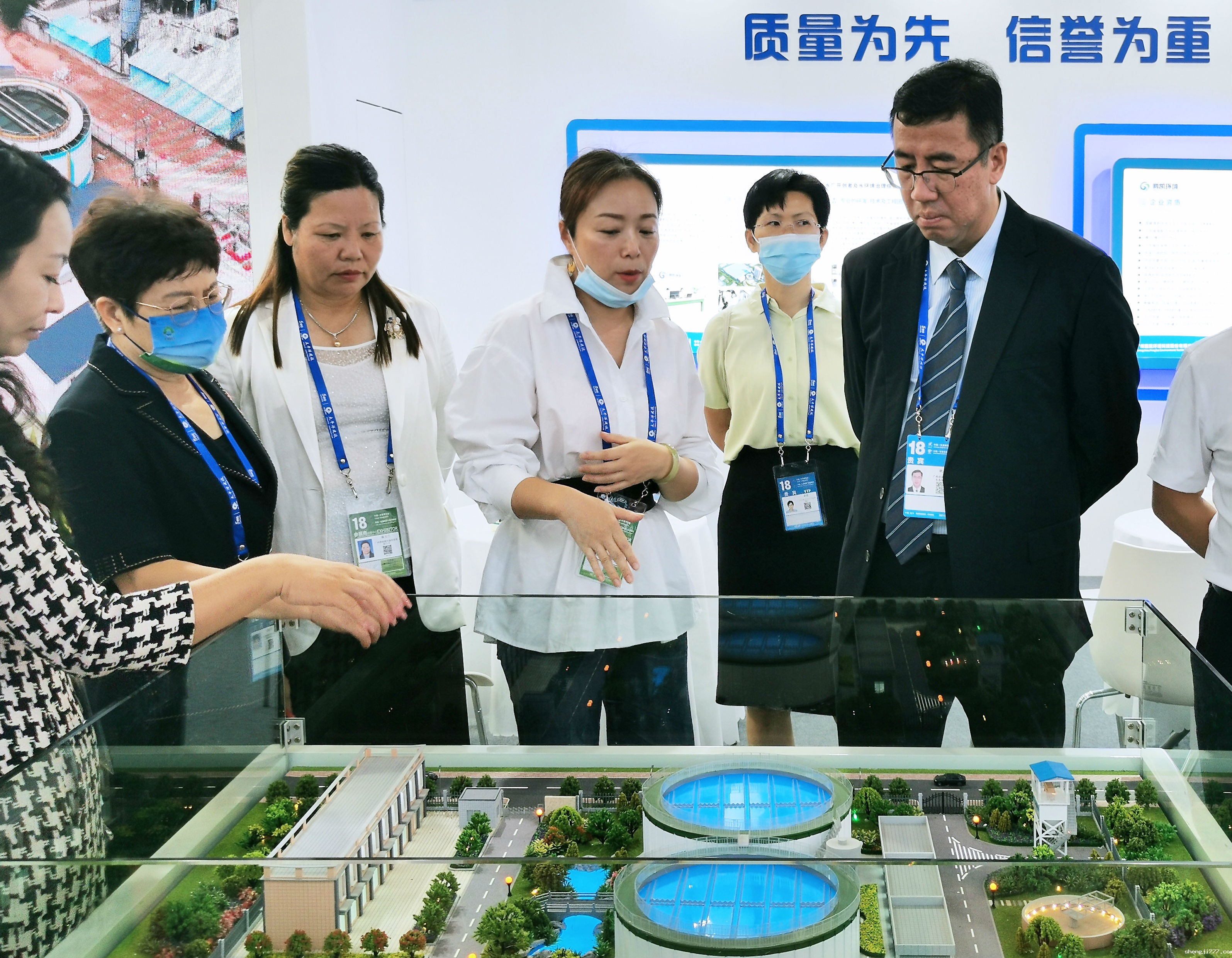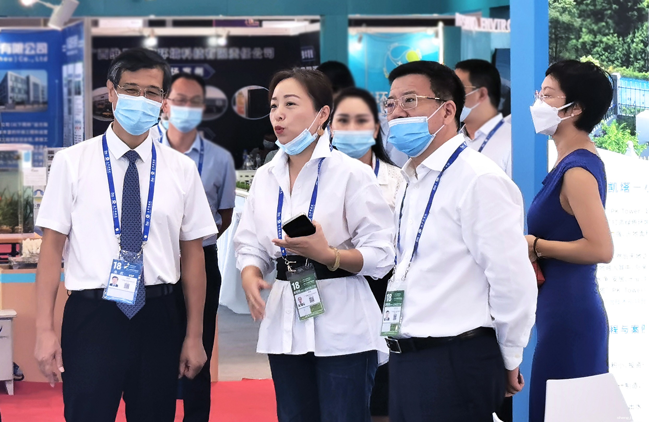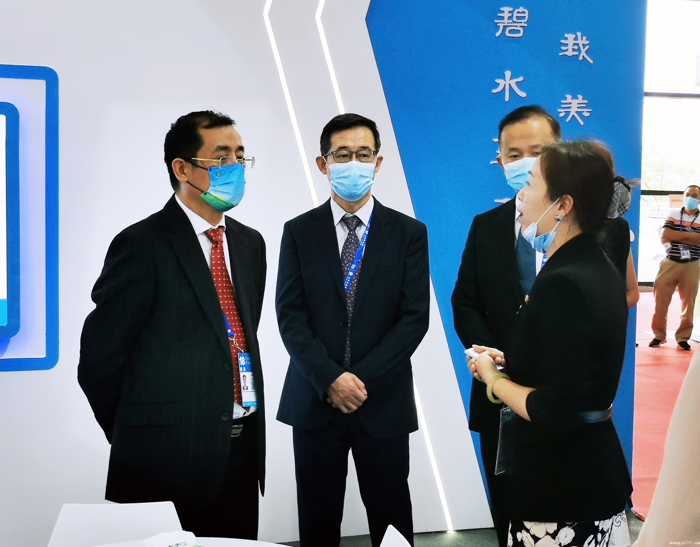 广西壮族自治区生态环境厅党组书记、厅长陈亮(左一),生态环境部国际合作司巡视员孙雪峰(左二),广西现代物流集团总经理、广西环保集团董事长刘鑫(左三)莅临优米app赚钱展位参观指导