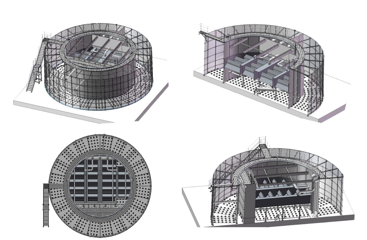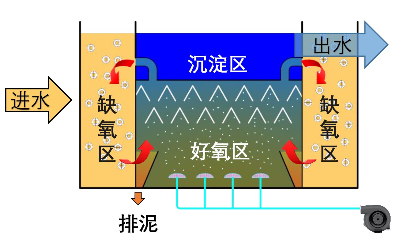 此外,鹏凯圆还增加了一个能耗的回收环节,将好氧区的曝气尾气收集,作为气提动力,实现好氧区混合液回流到外圈。所以本系统内没有混合液回流泵,没有刮泥机等动力设备,自然能耗也降低,再加上曝气量的充分利用,使它的效率可以更高,也契合现在对环保产业能耗降低,碳排放量减少的要求。